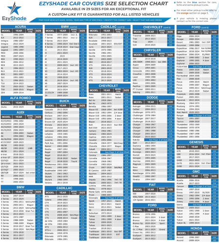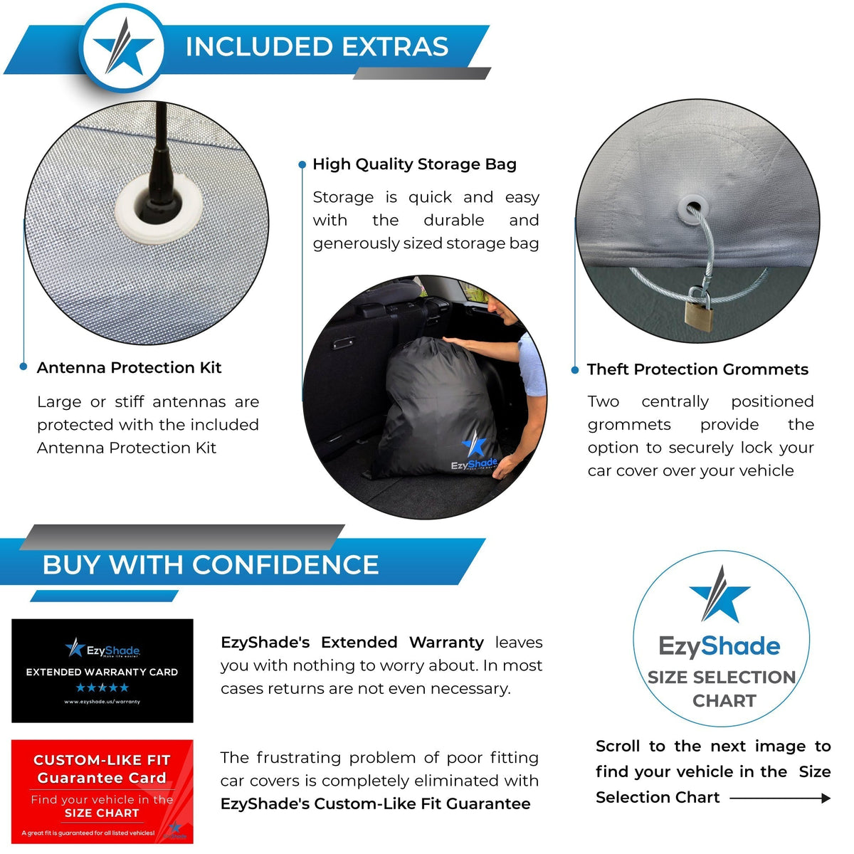 EzyShade Car Covers are 100% waterproof and weatherproof. The cover’s heavy duty materials are machine cut, multi-layered and bond-pressed for optimal weather proofing, paint protection, and enhanced durability.