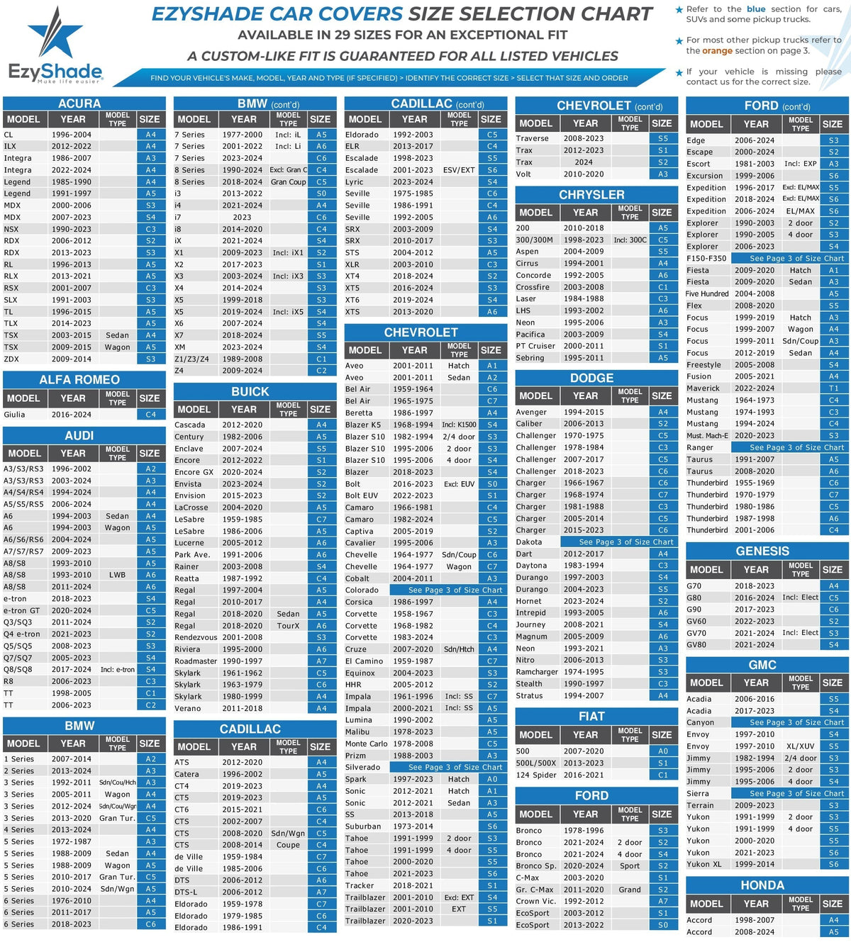 Features: Front, middle and rear straps with click-tight buckles protect against strong winds, reflective strips provide night visibility, a side door zipper allows easy vehicle access, specially designed mirror pockets fit any mirror without looking baggy, cable lock grommet holes offer protection against theft, a generous storage bag allows easy-stuff storage, and an antenna protection kit is included in every purchase. NOTE: To ensure a better fit for all sports/classic cars and pickup trucks, EzyShade’s C and T Size covers do not have mirror pockets.